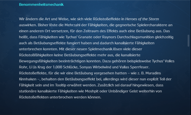 Dadran will Blizzard jetzt arbeiten: Nach dem Patch am 30.06 „The Eternal Conflict“ werden nurnoch Stuneffekte wie z.b. Muradin’s Sturmschlag Li Li’s Krug der 1.000 Schlücke ( kanalisierte Fähigkeit, bei der man sich noch bewegen kann = kanalisierte Bewegungsfähigkeit ) unterbrechen können, nicht mehr Seargent Hammer’s Erschütternde Explosion ( Rückstoßeffekt ).