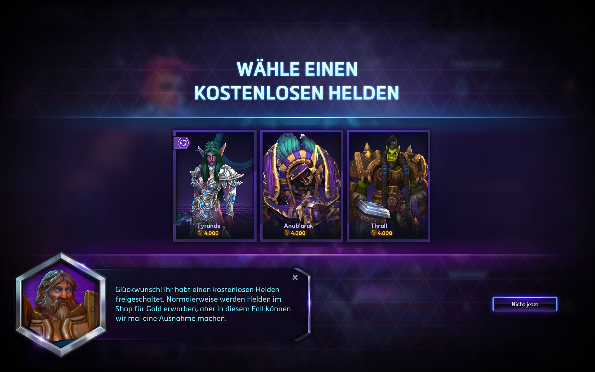 Zunächst besteht die Auswahl lediglich aus Tyrande, Anub’arak und Thrall. Sollte man diese 3 Helden bereits besitzen, wird eine weitere 3-Helden-Auswahl dargelegt, welche aus Nazeebo, Sonya und Uther besteht. Alle Helden haben den gleichen Wert, also ist es nicht weiter von Belang, welchen der Helden man sich aussucht. Man kann (und sollte!) nach Lust und Laune entscheiden. Fehlt euch gerade ein Tank? Dann könnte Anub’arak beispielsweise genau die richtige Entscheidung für euch sein. Diese sechs Helden sind in Blizzards engerer Auswahl gelandet.
