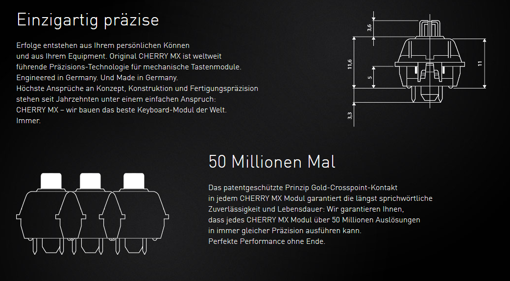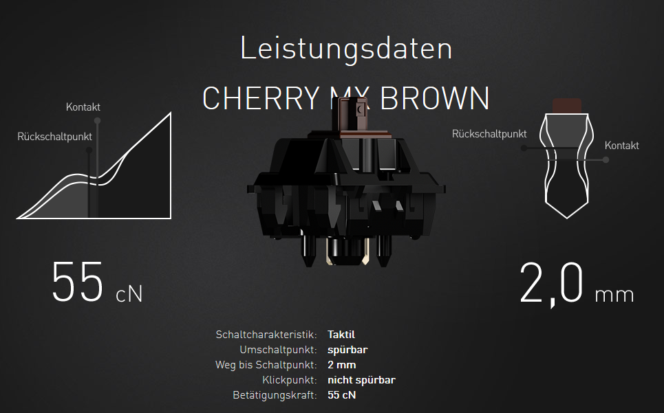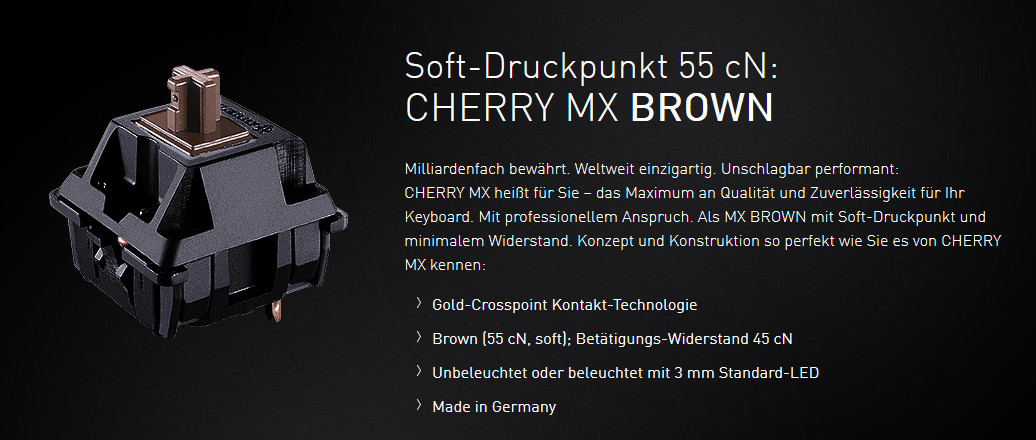 Die braunen Cherry-MX-Schalter sind nicht umsonst die Allrounder unter den MX-Schaltern. Eine gute Kombination aus leichtem Feedback und präziser Tastenauslösung. Sie sind somit ideal für Spieler und Vielschreiber geeignet.