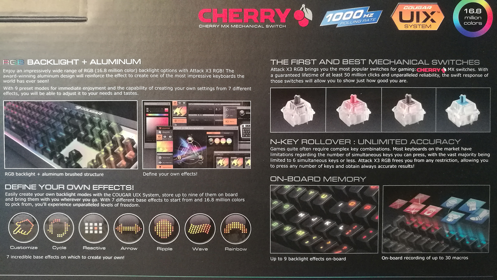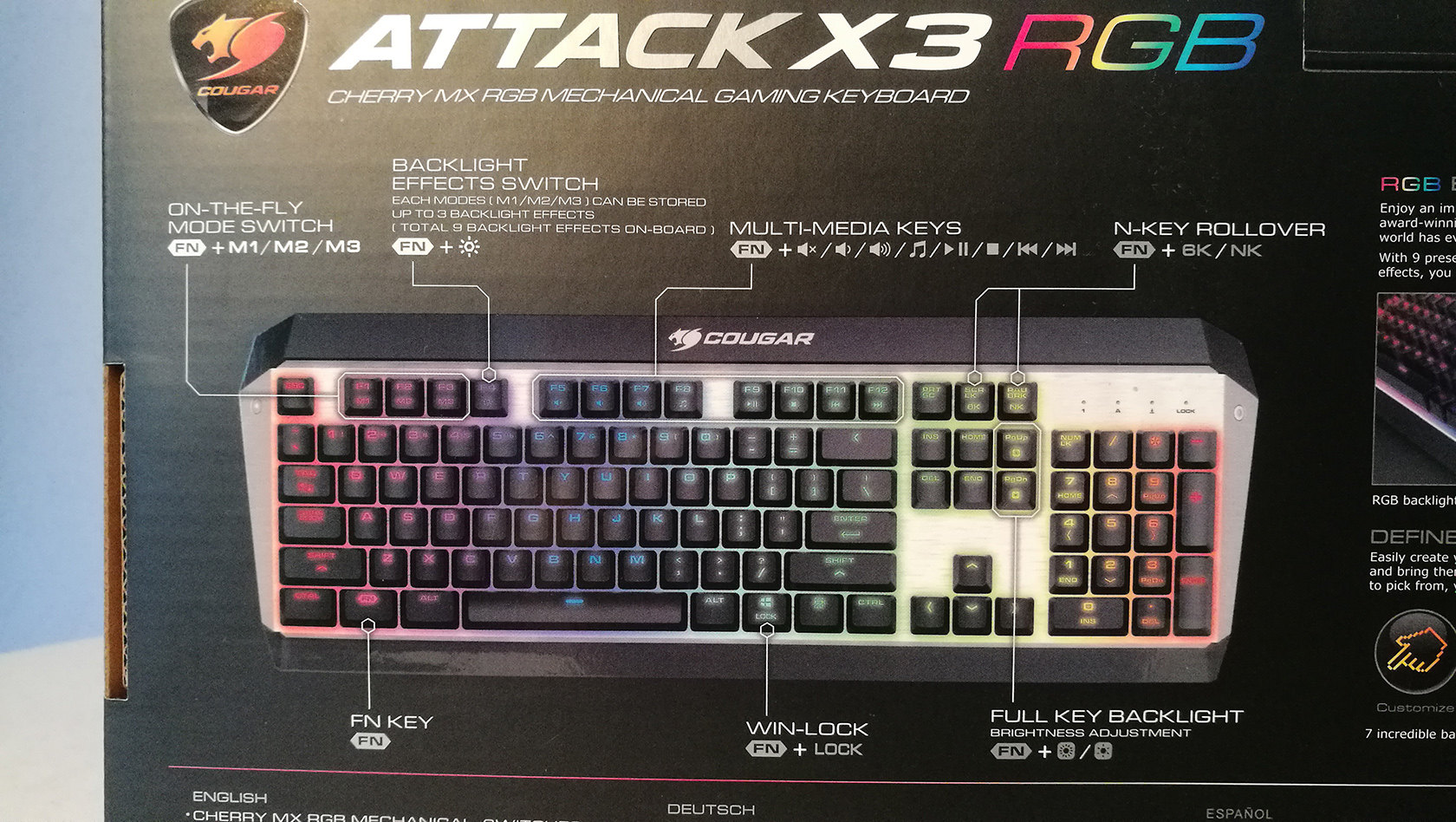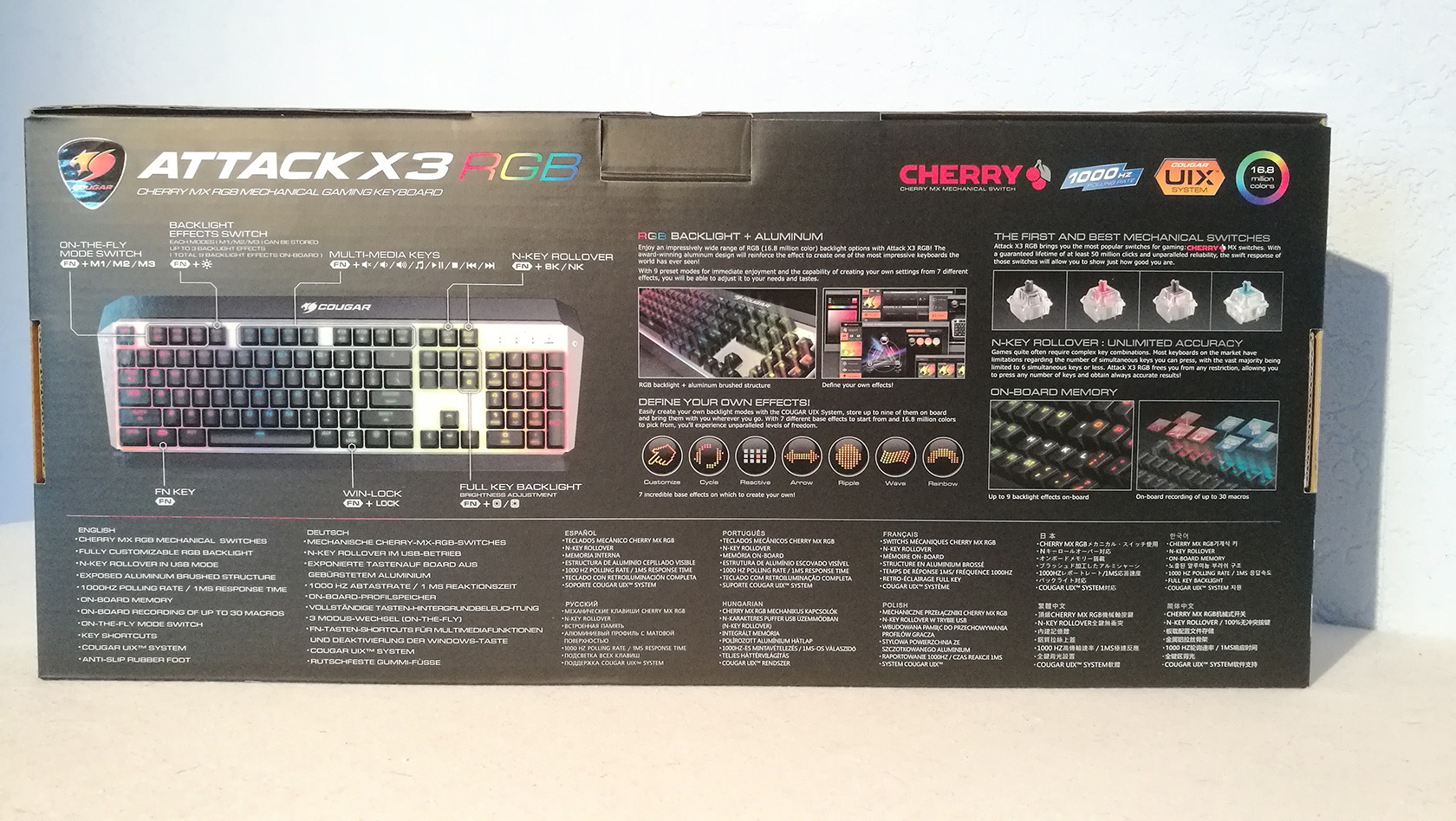 Auf der Rückseite befinden sich alle wichtigen Informationen. So sieht man eine kleine Abbildung der Attack X3 RGB samt Tastenerklärung der Doppelbelegung durch Nutzung der FN-Taste. Rechts daneben sind 8 Abbildungen mit den wichtigsten Kernfeatures abgebildet. So sieht der Käufer direkt, dass er hier eine mechanische Tastatur mit Cherry MX Switches erhält. Darüber hinaus wird auf weitere Features hingewiesen, wie zum Beispiel N-Key Rollover, 1000HZ Polling Rate, 1ms Response Time, On-Board Speicher, Aluminiumoberfläche, Multimediatasten, Cougar UIX System-Software und Anti-Slip Rubber Foot.