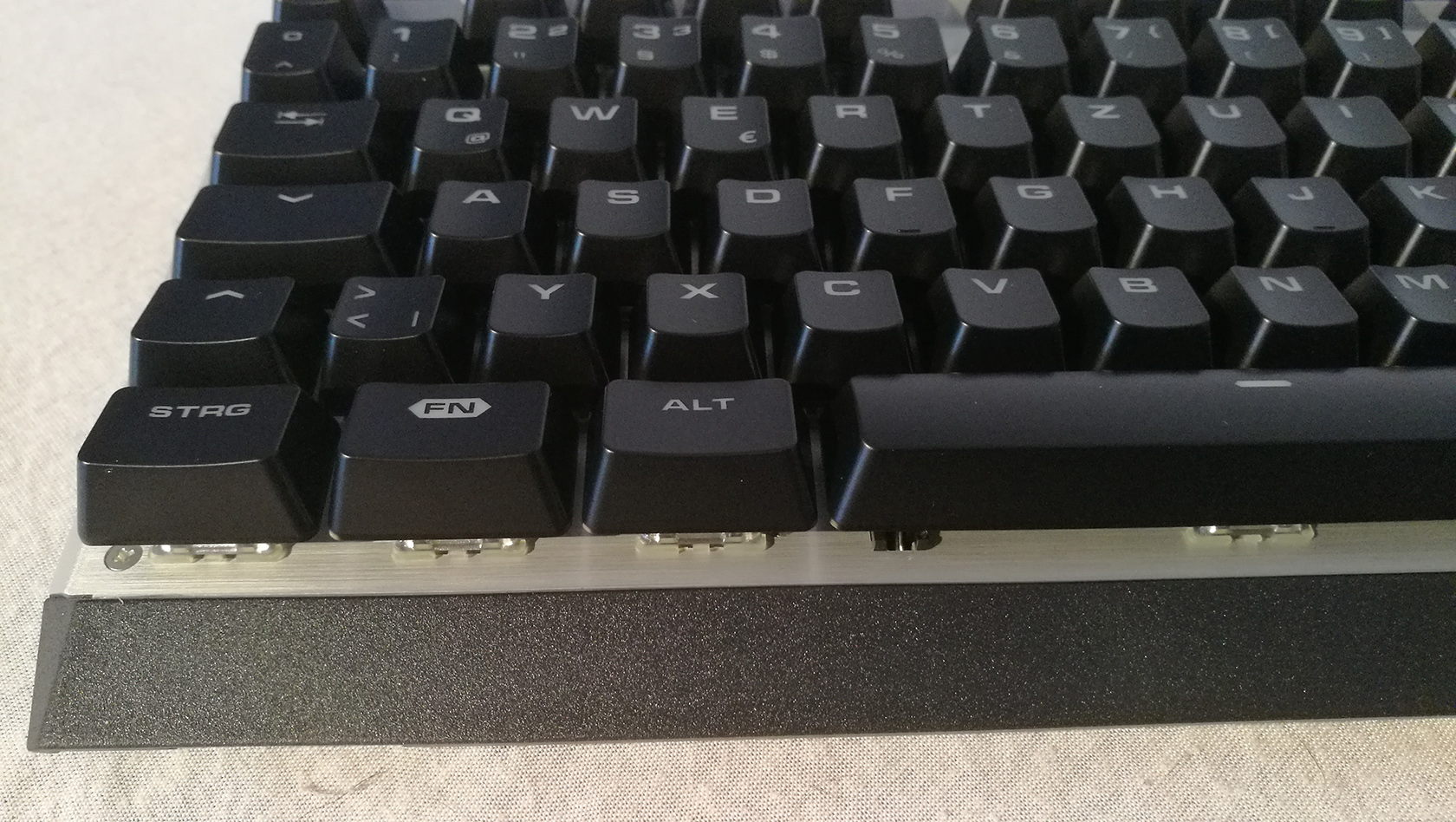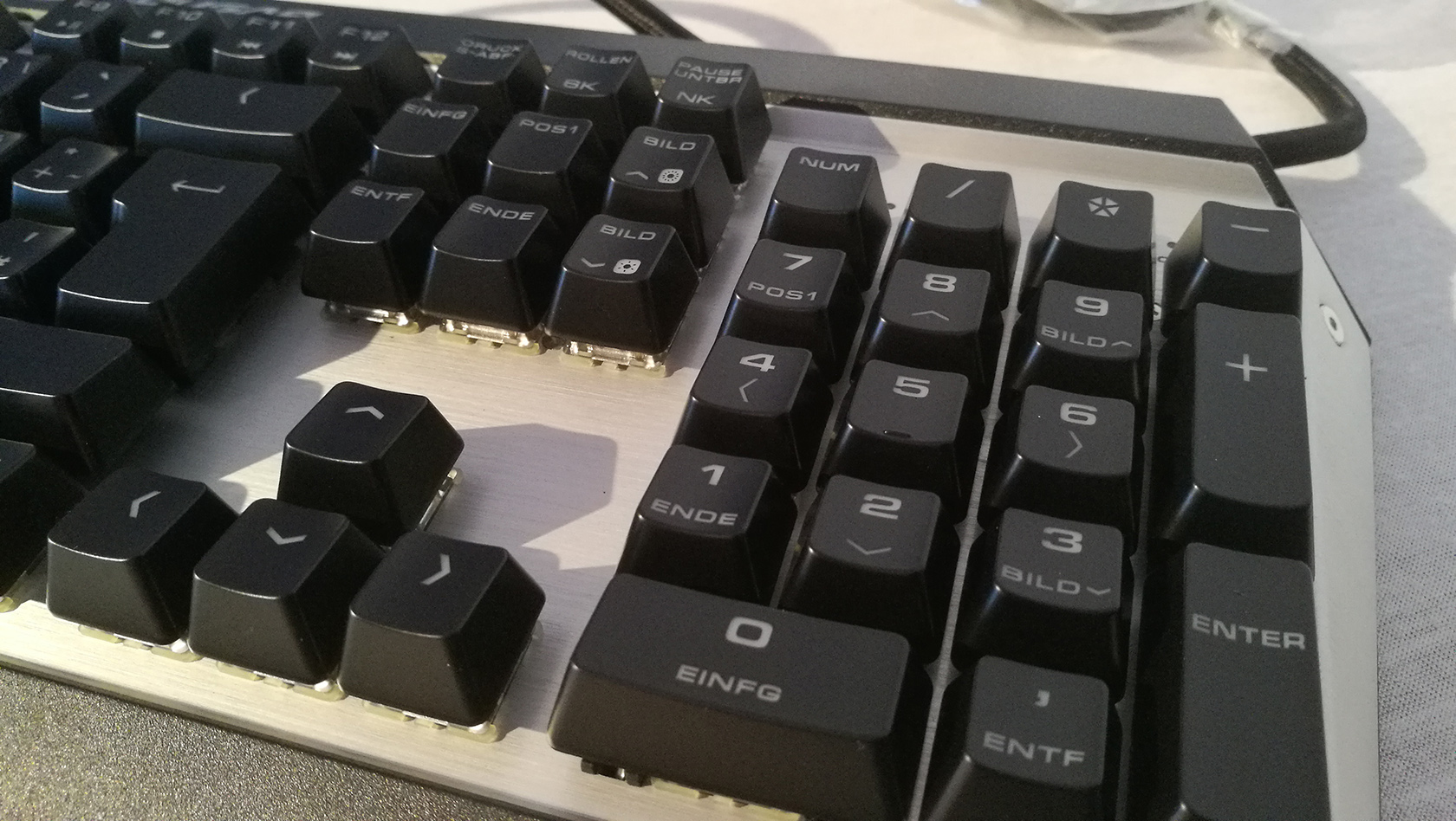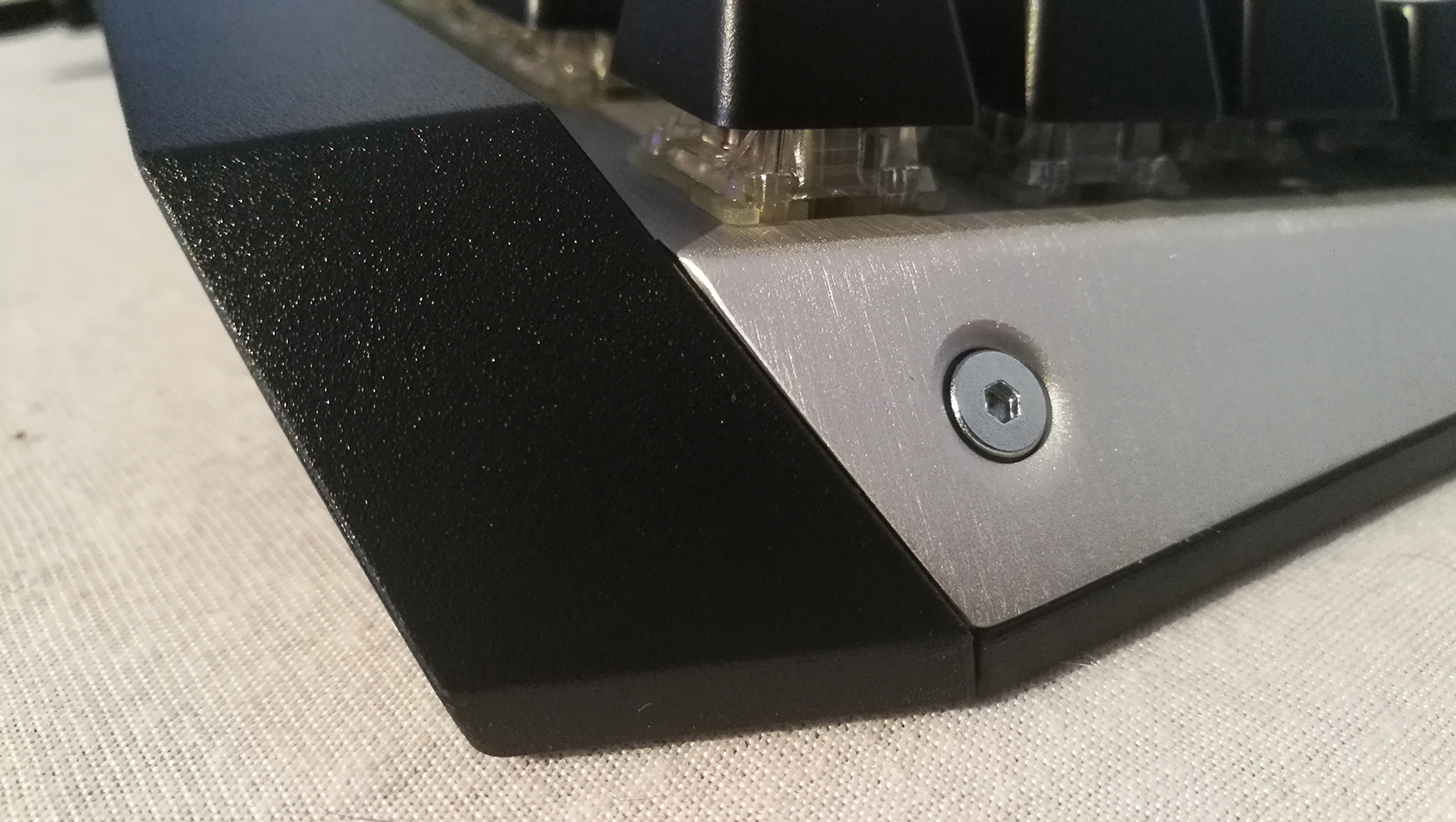 Bei der Attack X3 RGB setzt der Hersteller Cougar komplett auf matte Tasten, dies sieht natürlich sehr hübsch und hochwertig aus. Unterstrichen wird der Eindruck durch die komplett verschraubte Aluminiumoberfläche. Beides fühlt sich auch sehr hochwertig an, man merkt direkt, dass hier keine Billigmaterialien verwendet wurden.