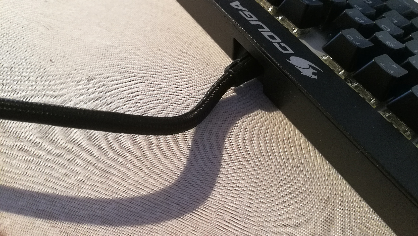 Das USB-Kabel ist mit einem Gewebe umflochten, um so das Kabel noch mal extra zu schützen, allerdings hat man es hier ein wenig übertrieben, denn das Kabel ist wenig flexibel, im Vergleich zu anderen Tastaturen. Auf eine Handballenauflage muss man leider verzichten, denn die Attack X3 RGB gibt es nur ohne Handballenauflage. Dies liegt aber wie immer im Auge des Betrachters, viele schwören auf solch ein Feature und andere sind froh, wenn man keine hat. Auf der Unterseite der Attack X3 RGB befinden sich vier Gummiflächen, dies klingt nach ziemlich wenig, aber hier können wir euch beruhigen, denn die Gummiflächen sind so groß ausgefallen, dass hier vier Stück völlig ausreichend sind, um die Tastatur im Eifer des Gefechts nicht einfach mal so zu verschieben.