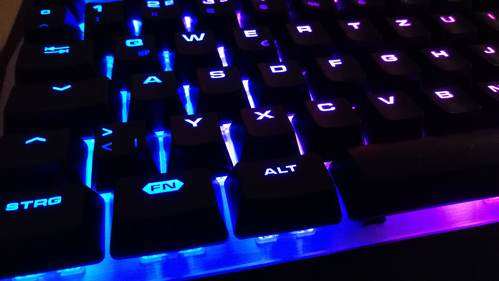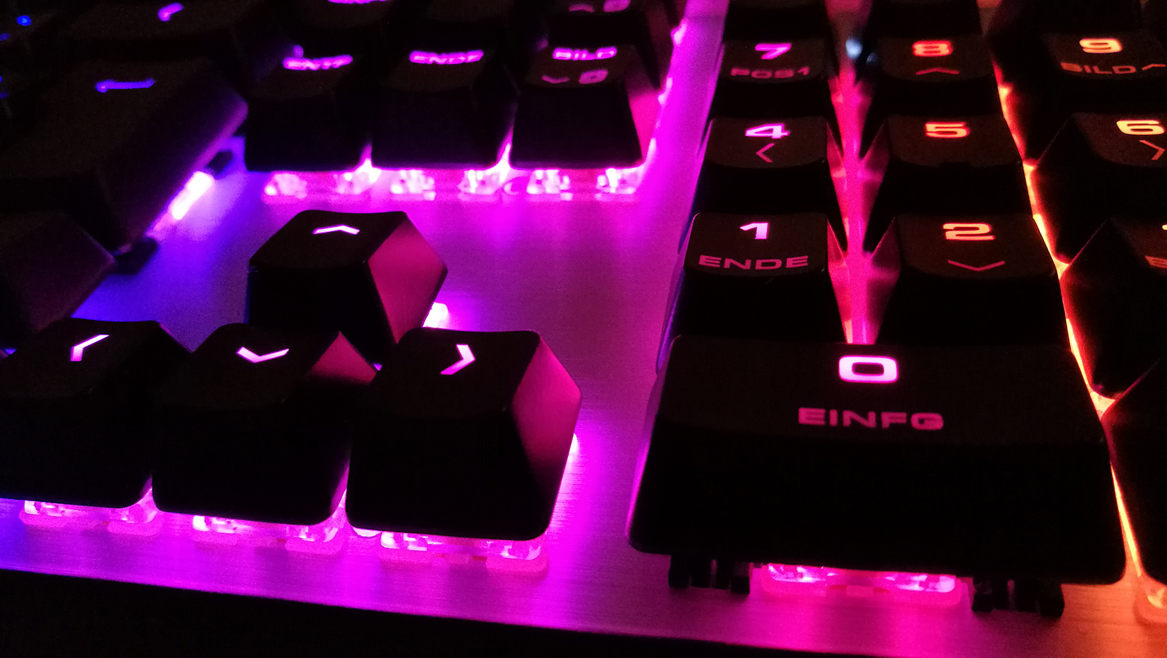 Die LED-Beleuchtung ist sehr gut umgesetzt worden, diese kommt mit dem vollen RGB Farkspektrum daher. Die Attack X3 RGB wird mit einer knalligen LED-Beleuchtung ausgeliefert, welche über verschiedene Helligkeitsstufen angepasst werden kann, auch kann man verschiedene Effekte einstellen (siehe unten bei Software). Da die Tasten im Vergleich zu herkömmlichen Tastaturen offen liegen und da die Attack X3 RGB eine Aluminiumplatte hat, wird der Leuchteffekt optisch gut verstärkt. Eine kleine Änderung gibt es auch oben rechts auf der Tastatur, bei der Attack X3 haben wir hier bemängelt, dass diese Tasten nur leuchten, wenn diese aktiv sind, nun hat man diese einfach weggelassen und hat dort Status-LED’s angebracht. Finden wir sehr gut so, denn die Tasten waren recht gewöhnungsbedürftig bei der X3.