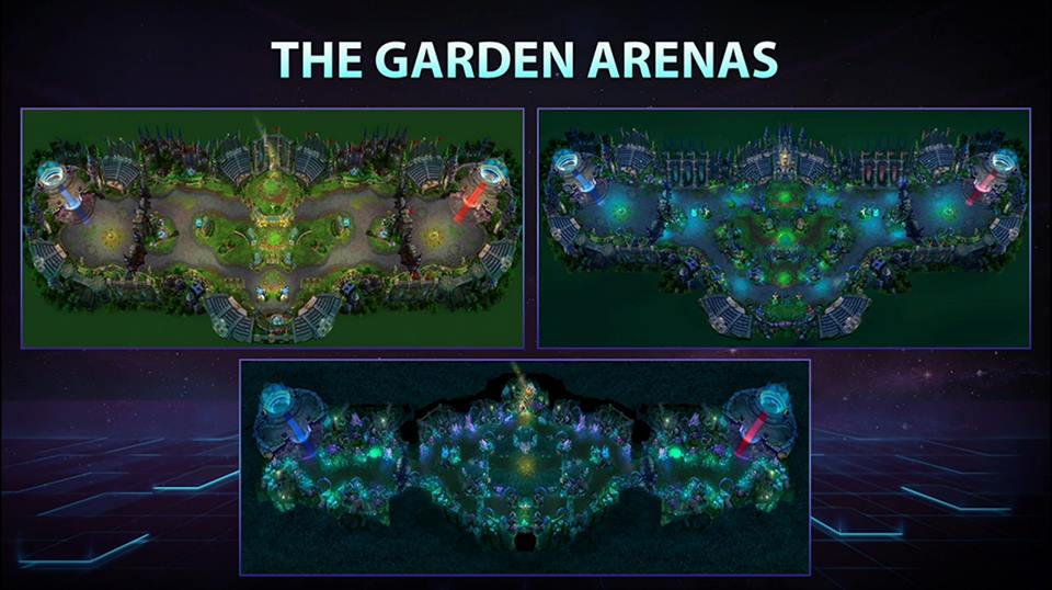 Momentan gibt es zwei Arena-Karten. An weiteren wird jedoch gearbeitet und werden definitiv noch erscheinen. Die erste Arena-Karte ist „Garten des Terrors“, welche natürlich bereits als große Map bekannt ist. Diese wird in 3 verschiedenen Phasen zu spielen sein. Die erste Phase ist der Tag-Modus, welcher das ganze Spektakel wirken lässt wie in der Renaissance. Man bekämpft sich in der Arena. Bei einem Multi-Kill werden die Zuschauer, welche sich den ganzen Kampf anschauen, dem dominierenden Team sogar zujubeln. Die zweite Phase ist der Nacht-Modus. Das Ambiente ist dort, dass die Bevölkerung, welche um ein Lagerfeuer herum sitzt. Die dritte Phase ist der Untergrund der Map. Das sehr düstere Design leuchtet nur durch Kristalle und Pflanzen, die sich dort befinden. Die zweite Arena ist „Tempel des Himmels“. Die drei Arena-Phasen heißen hier Merkwürdig, Oasis und Wüste. (Von uns selbst übersetzt, keine Gewähr auf Richtigkeit)