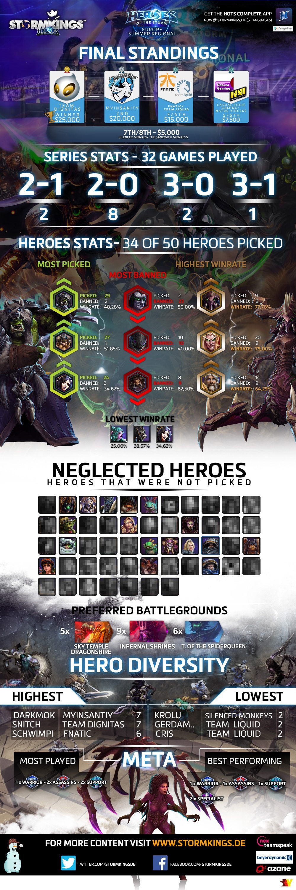 3 Tage Pro-Games liegen hinter uns und es gab unglaublich viele spannende Spiele. Wir haben für euch alles aufgeschrieben und eine Infografik zum Turnier erstellt. Herzlichen Glückwunsch an Team Dignitas zum Sieg des Europe Summer Regional #1 und somit zur Qualifikation zum Heroes Summer Global in Schweden.