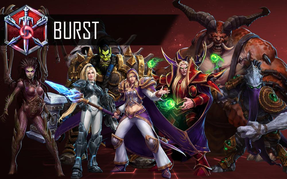 Jaina, Zeratul, Kael’thas und Nova erreichen den Burst-Schaden damit, dass sie alle Fähigkeiten auf einmal einsetzen und die Gegner damit von vollem Leben auf geringste Gesundheitspunkte bringen oder sogar töten und das in einer sehr kurzen Zeitspanne. Heißt aber auch, dass sie mit Auto-Attacks nicht viel anfangen können, sodass sie auch alles auf einmal werfen müssen, um sich dann an einem sicheren Platz zu regenerieren. Die richtige Reihenfolge der Fähigkeiten Rotation sind wichtig um den maximalen Schadens-Output zu erreichen. Genauso wichtig sind dabei die Positionieren und die Fluchtwege.