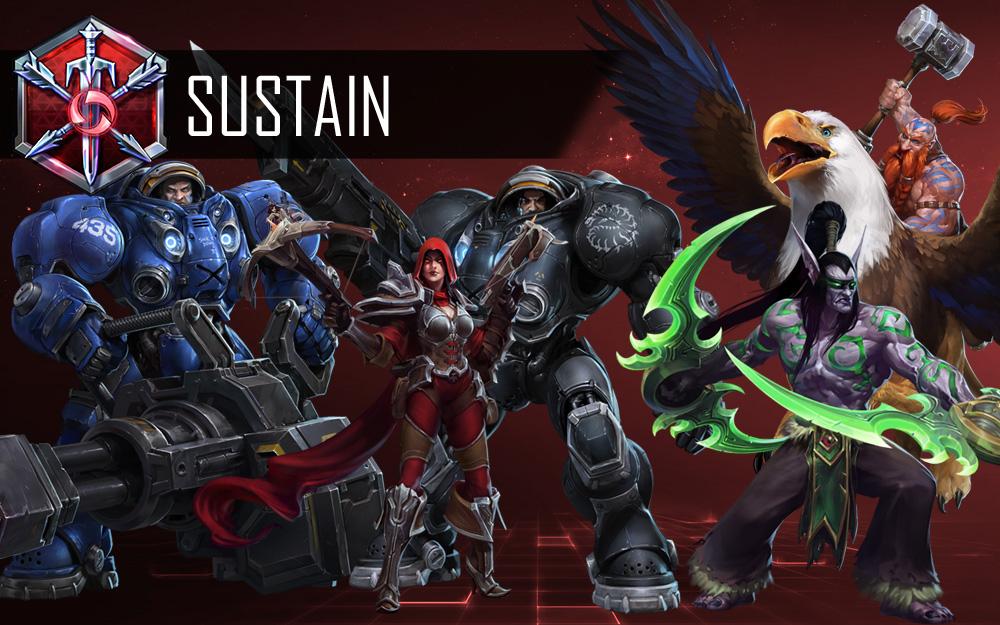 Sustain-Helden fügen ihren Schaden langsam, aber sicher zu. Die Fähigkeiten-Rotation ist nicht so schnell, dass sie einen gegnerischen Helden von der Karte wischen, um dann erstmal die Abklingzeit der Skills für 15 Sekunden abzuwarten. Stattdessen fügen sie starken Auto-Attack Schaden zu, haben Schadens-Buffs und zusätzliche Fähigkeiten, um nach und nach die Gesundheit des Gegners zu gefährden, zusammen mit hohen Schadens-Zahlen am Ende des Spiels. Wenn ein Sustain-Held gut gespielt wird, wird das gegnerische Team scheinbar immer bei 40% der maximalen Gesundheit oder sogar noch weniger sein, weil sie dauerhaft „poken“ und konsistent Schaden zufügen.