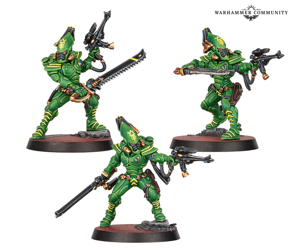 Aspektkrieger sind die besten Nahkämpfer der Aeldari. Das sind Krieger, die sich voll und ganz einem Aspekt des Aeldari-Kriegsgottes Kaela Mensha Khaine verschrieben haben. Die Striking Scorpions zum Beispiel verkörpern Khaine als Jäger, der heimlich auf seine Beute lauert, bewaffnet mit Blastern und robuster Rüstung.