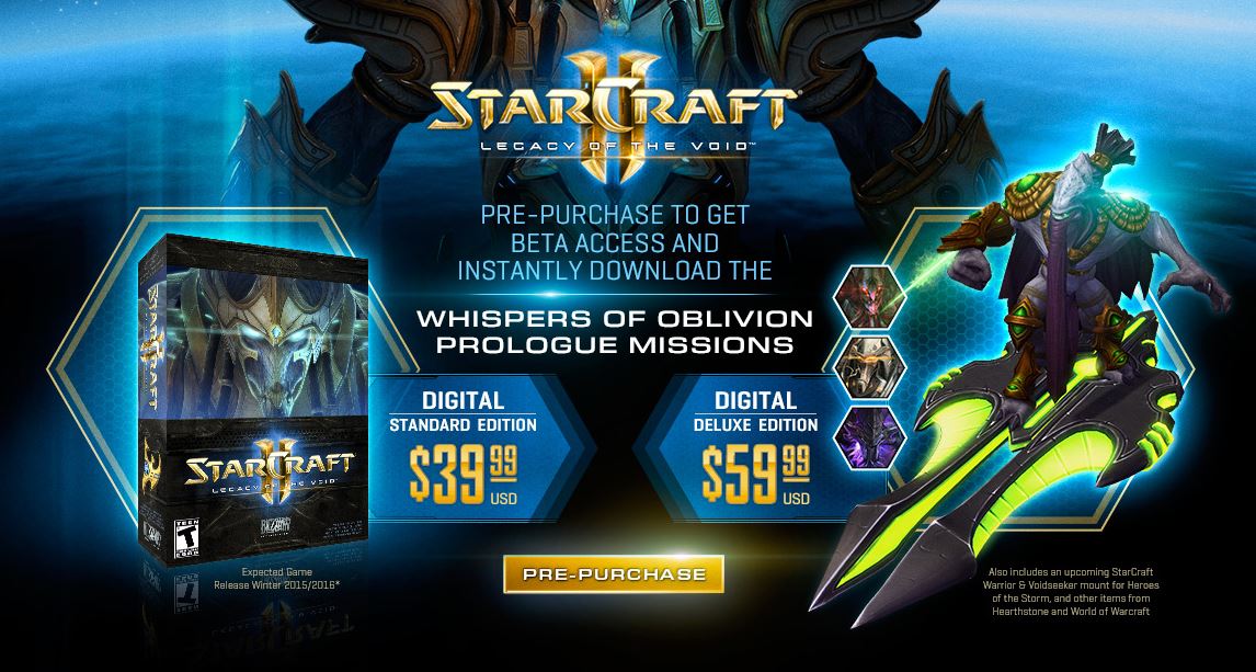 Wie soeben bekannt wurde, gibt es beim Kauf von Starcraft 2 – Legacy of the Void ein ganz besonderes Schmankerl. Es wird einen noch unbekannten weiteren Starcraft Helden geben (Selendis oder Artanis?) und ein Voidseeker Reittier wird einem freigeschaltet, wenn man sich für den Kauf der Digital Deluxe Edition von Starcraft 2 – Legacy of the Void entscheidet.