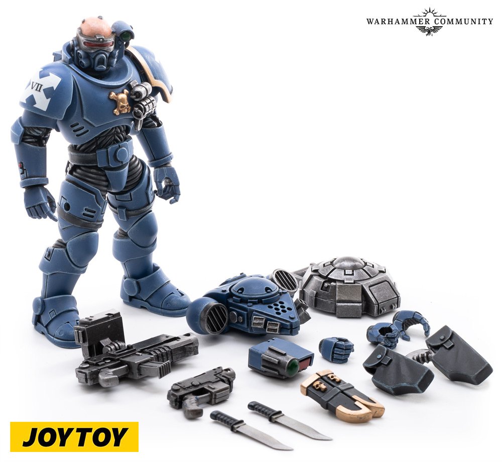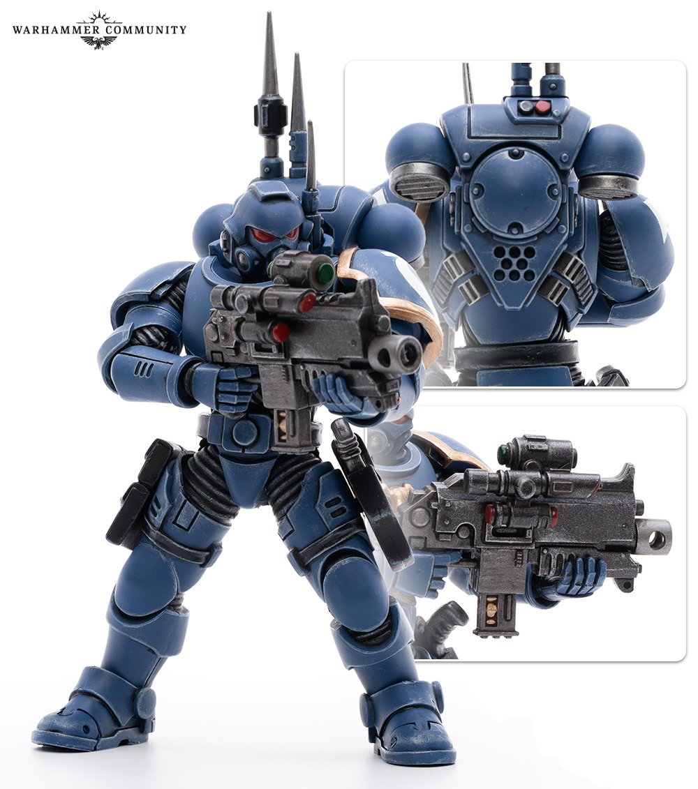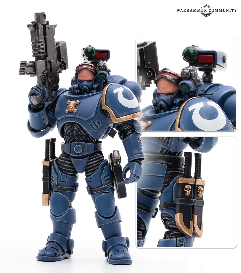 Jede Figur ist 12 cm groß mit 25 beweglichen Punkten und ist vollständig mit komplizierten Details bis hin zu Kadermarkierungen und Kantenhighlights vorbemalt. Originalgetreue Nachbildungen der Ausrüstung können nach Belieben angebracht und wieder abgenommen werden, sodass ihr leicht vergrößerte Versionen eurer Vanguard-Ultramarines zusammenbauen könnt.