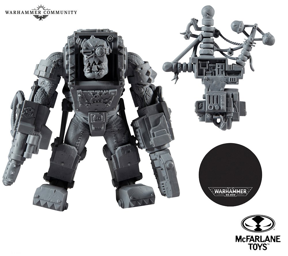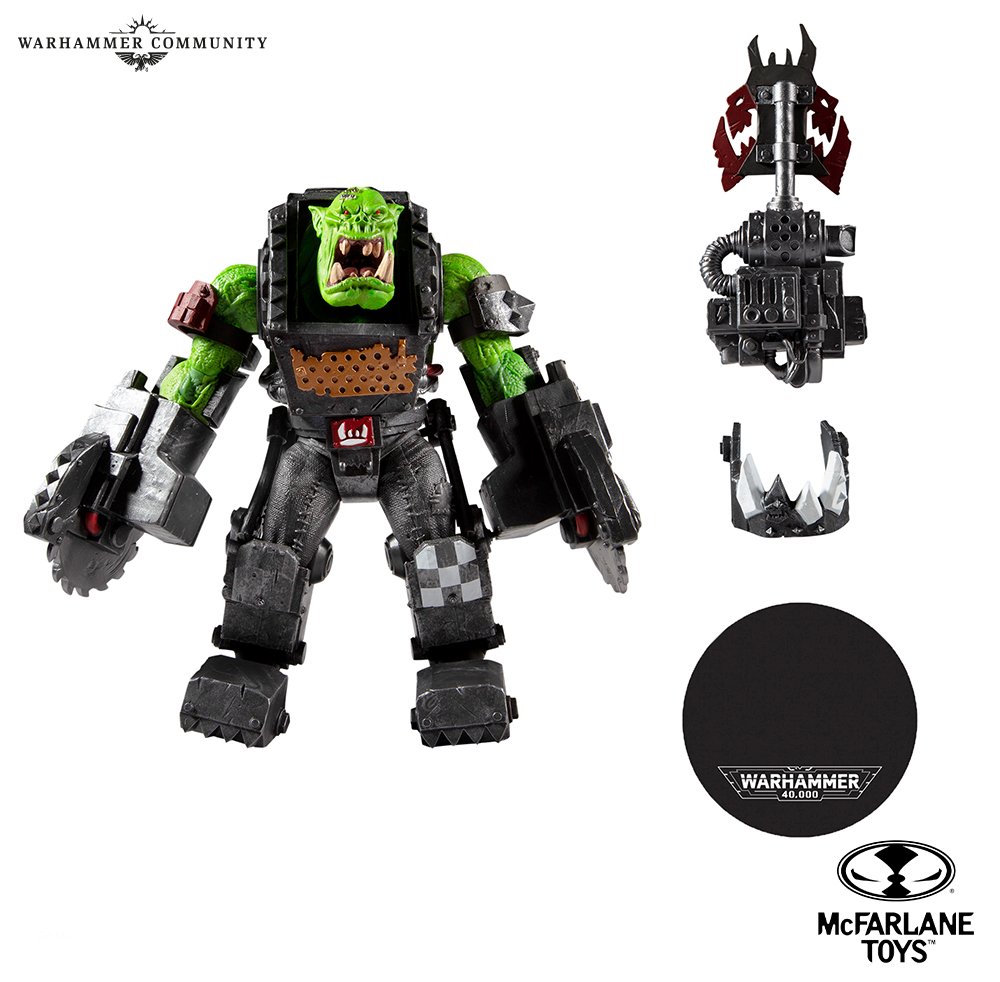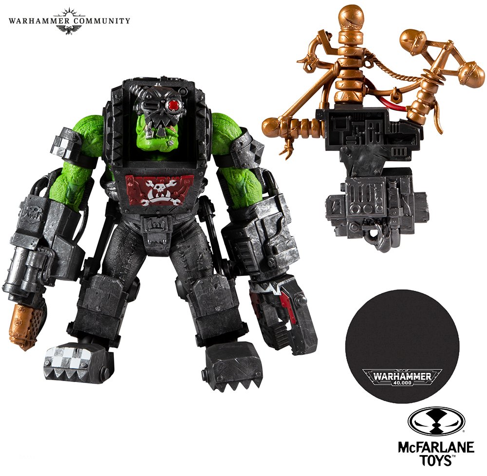 Dä Orkz sin´da! Die erste von vier Grünhaut-Actionfiguren von McFarlane Toys zeigt einen Ork Meganob, der mit einer Kustom-Shoota und einer Energieklaue bewaffnet und in eine Mega-Rüstung gekleidet ist. Ihr könnt seine Rüstung auch mit einem optionalen Rucksack mit befestigter Bannerstange ausstatten und ihm den Metallkiefer anlegen, ohne den kein Nob mit Selbstachtung gesehen werden würde.