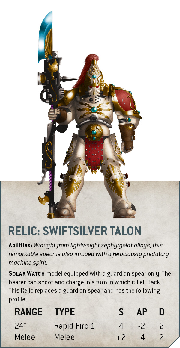 Fähigkeiten: Solar Watch-Modelle sind nur mit einem Wächterspeer ausgestattet. Der Träger kann in einer Runde schießen und angreifen, in der er zurückfiel. Dieses Relikt ersetzt einen Wächterspeer und hat das folgende Profil: