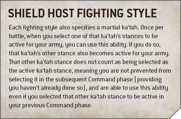 Wenn ihr den „Martial Ka’tah: Rentax mit eurer Armee benutzt, könnt ihr beide mächtigen Haltungen im Laufe des Spiels einnehmen, sodass ihr in jeder Runde eine andere Wahl eines armeeweiten Bonus habt. Jeder Schildhost hat eine bevorzugte Ka’tah, die zusätzliche Vorteile freischaltet.