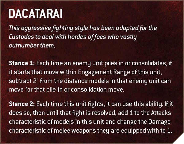 Wenn ihr die Dacatarai Ka’tah als Schreckenshost beschwört, könnt ihr zu Beginn deines Zuges eine der beiden Haltungen aktivieren, aber beide verwenden. Falls ihr euch dann entscheidet, in der nächsten Runde in Dacatarai zu bleiben, könnt ihr immer noch Haltung zwei aktivieren, obwohl ihr den Vorteil bereits hattet.