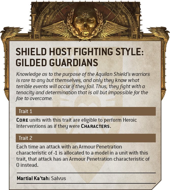 Egal welchem Schildhost ein Custodes verpflichtet ist, sie alle sind in erster Linie Diener des Imperators. Dadurch können Sie jederzeit auf die vom Imperator auserwählte Schildhoste zurückgreifen.