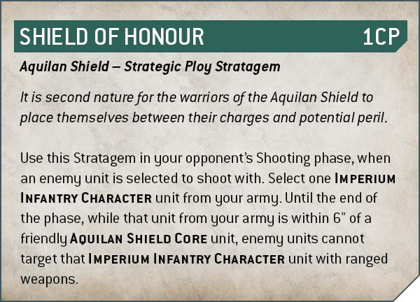 Benutze dieses Stratagem in der Schussfläche deines Gegners, wenn eine feindliche Einheit zum Schießen ausgewählt wird. Wähle eine Imperium-Infanterie-Charaktereinheit aus deiner Armee. Bis zum Ende der Phase, solange sich diese Einheit eurer Armee innerhalb von 6 Zoll um eine befreundete Aqulian-Shield-Core-Einheit befindet, können feindliche Einheiten diese Imperium-Infanterie-Charaktereinheit nicht mit Fernkampfwaffen anvisieren.