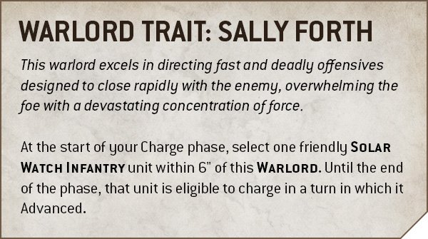 Wähle zu Beginn deiner Angriffsphase eine befreundete Solar-Watch-Infanterieeinheit innerhalb von 6 Zoll um diesen Kriegsherrn aus. Bis zum Ende der Phase kann diese Einheit in einem Zug angreifen, in dem sie vorgerückt ist.