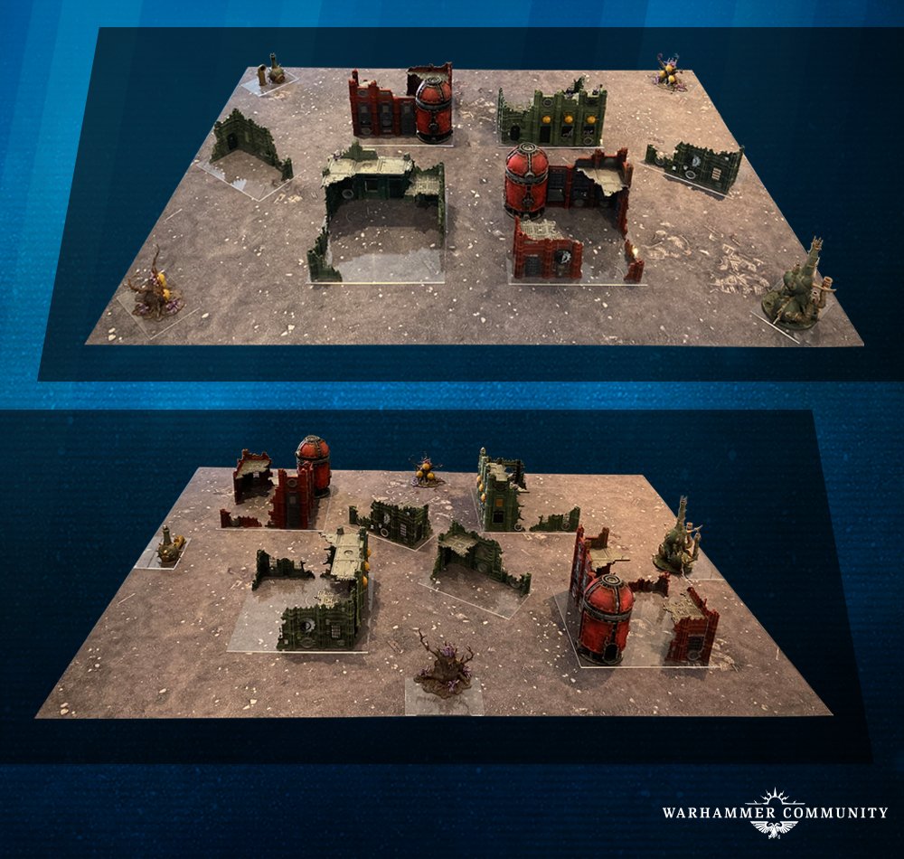 Warhammer 40.000 ist ein umwerfend visuelles Spiel, das die Fantasie mit wunderschön bemalten, fein detaillierten Miniaturen anregt, während sie inmitten der zerstörten Ruinen eines futuristischen Kriegsgebiets gegeneinander antreten. Die Terrain-Tische, welche bei den US Open GTs verwendet werden, sind schön hergerichtet. Sie sind mit verschiedenen Farben und Stilen bemalt worden, sodass man sich beim Spielen jedes Schlachtfelds in den Kampf hineinfühlen kann.