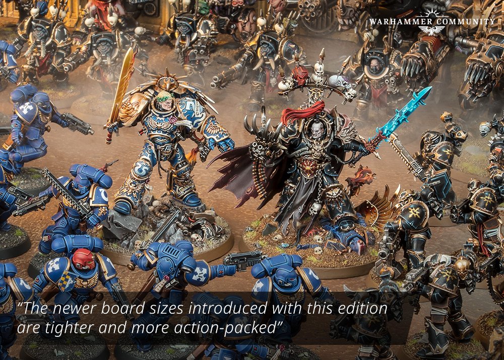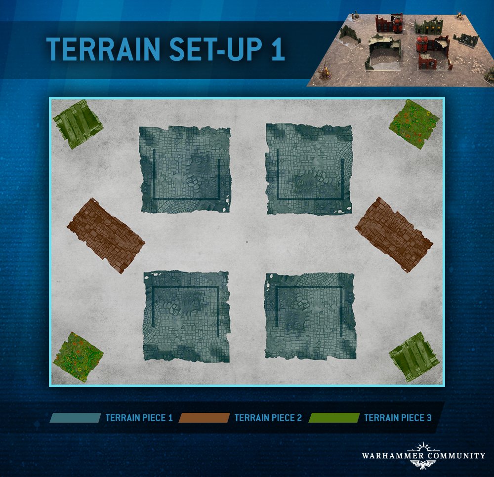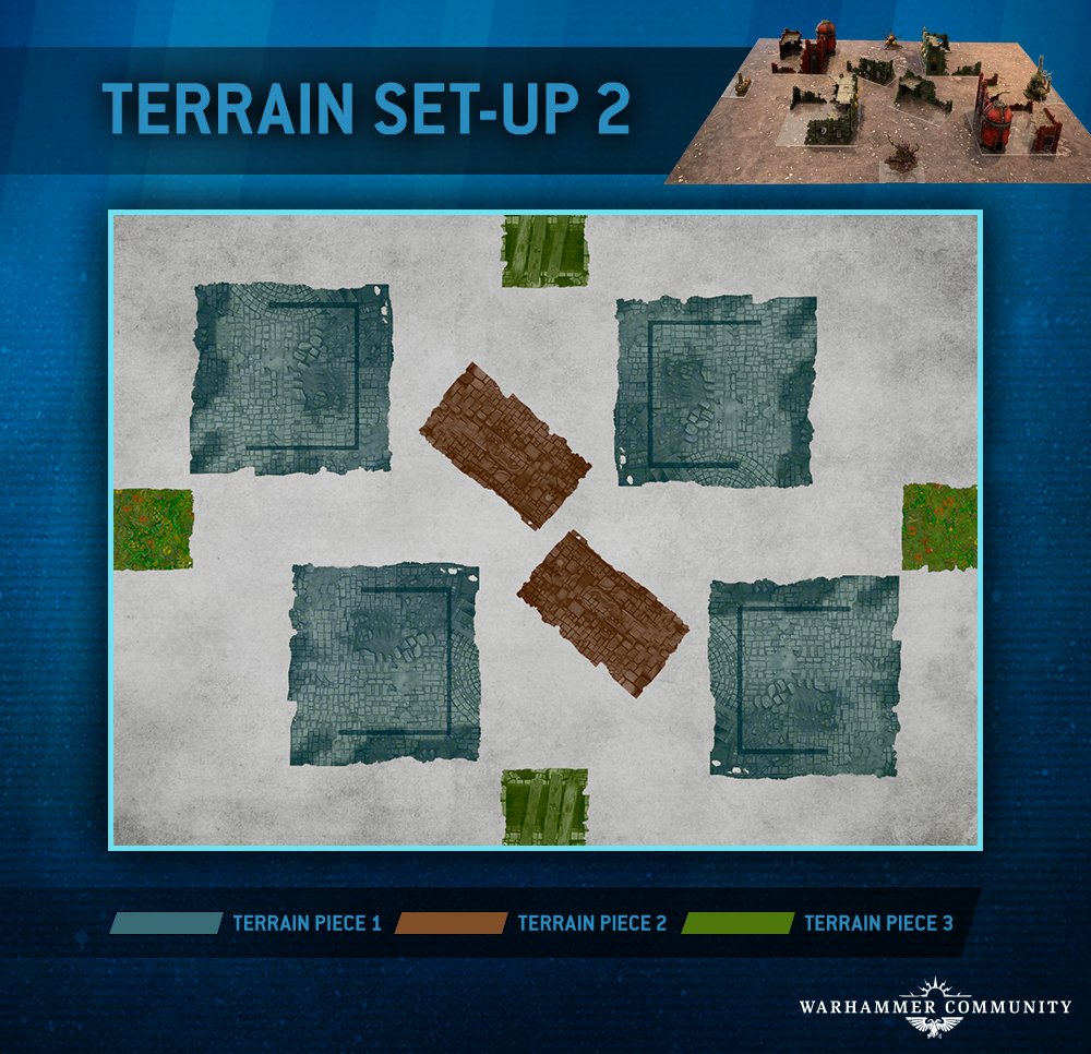 Jedes Spiel in einer bestimmten Runde des Turniers verwendet an jedem Tisch das gleiche Gelände-Layout. Die GT-Missionen für Warhammer 40K sind jedoch sehr unterschiedlich, wenn es um Einsatzzonen geht. Zu bedenken ist, dass die neueren Boardgrößen, die mit dieser Edition eingeführt wurden (60 x 44 Zoll), enger und actionreicher sind als die zuvor verwendete Standardtischgröße von 72 x 48 Zoll.