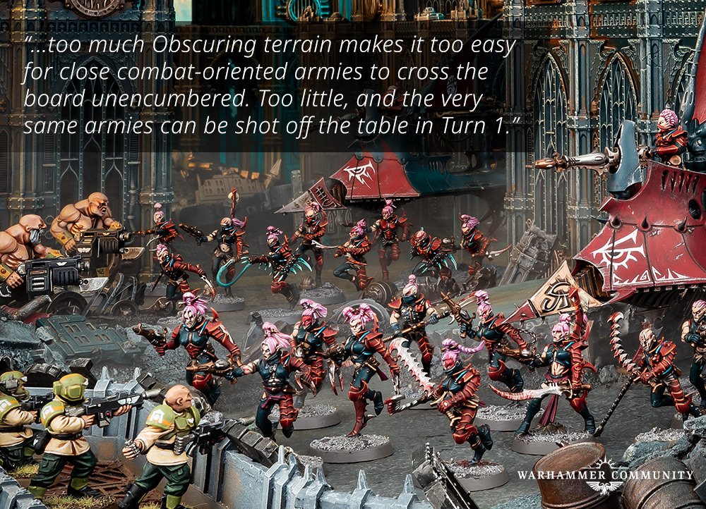 Das Konzept der Balance kommt auch bei der neuen Regel „Obscuring Terrain“ ins Spiel. Diese Regel lässt Spielern und Organisatoren viel mehr Freiheit bei der Gestaltung ästhetisch ansprechender, spielfreundlicher Schlachtfelder. Indem Spieler die Umrisse von verdeckenden Teilen als komplettes Gelände anerkennen, können diese Gelände die Sichtlinie dort blockieren, wo sonst in der Vergangenheit „wilde“ und unrealistische Schüsse erlaubt waren (z.B. das Abfeuern einer Kampfkanonengranate durch mehrere Fenster an der kaum sichtbaren Ecke eines rivalisierenden Kampfpanzers).