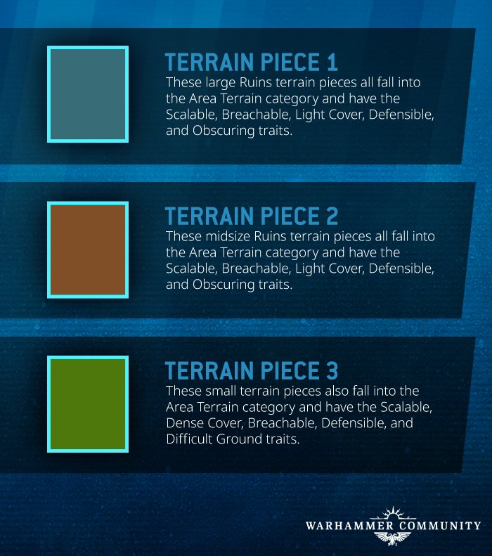 Das Layout, die Dichte und die Art des verwendeten Geländes haben einen dramatischen Einfluss auf den Verlauf einer Schlacht. Eine der großen Stärken von Warhammer 40K ist das völlig frische und neue Spielerlebnis, das Spieler haben können, indem sie einfach die Beschaffenheit des Terrains auf dem Spielfeld ändern.