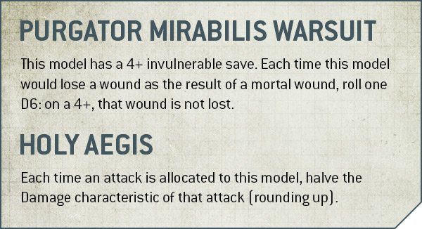 Während alle Paragon Warsuits einen unvergleichlichen Schutz für die Infanterie der Adepta Sororitas bieten, ist der „Purgator Mirabilis“ so weit von ihnen entfernt wie ein Astartes Power-Armor von einer gewöhnlichen Flakjacke. Mächtige Energiefelder stumpfen Angriffe ab, noch bevor sie die dicke Adamantinplatte erreichen können. Zudem wenden sie Schläge ab, die sogar die Todesengel des Imperators lähmen würden.