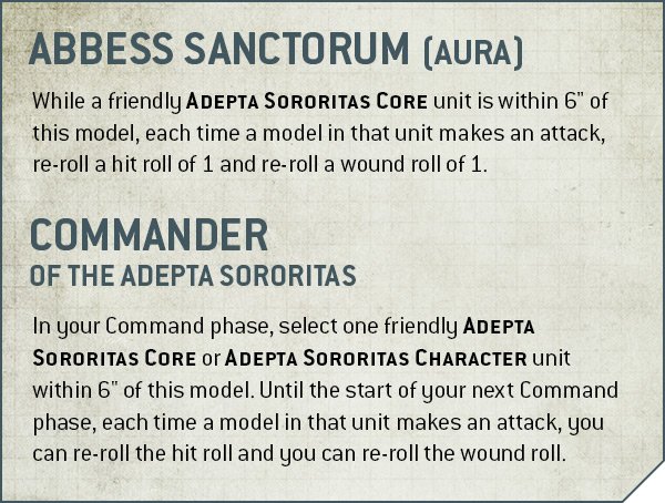 Trotz ihrer Vorliebe, in den heftigsten Kämpfen zu stecken, ist Morvenn Vahl in jeder Hinsicht die Kommandantin, welche von ihrer Position verlangt wird. Ihre Mitschwestern versammeln sich um die herrliche goldene Gestalt ihres Kriegsanzugs und kämpfen mit übermenschlicher Wildheit. Sie wissen, dass ihr Oberbefehlshaber genauso wie sie bereit ist, ihr Leben für den Gottimperator niederzulegen.
