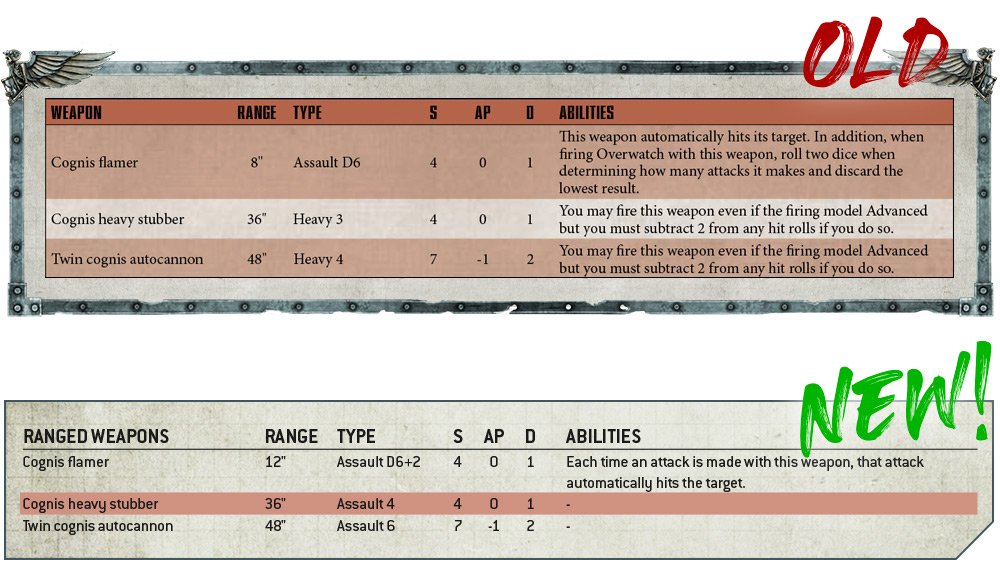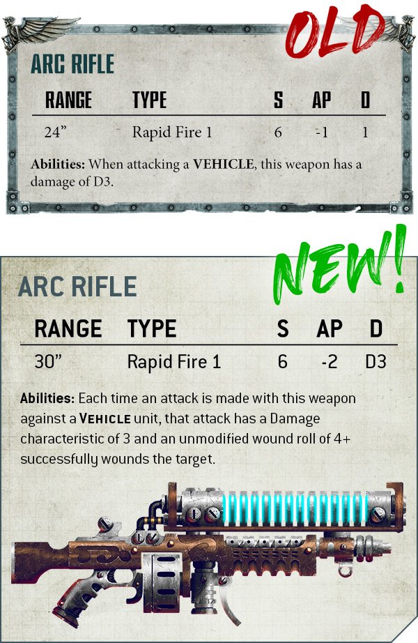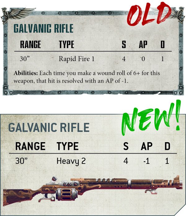 Unter den Armeen des Imperiums haben die Adeptus Mechanicus einen großen Teil der fantastischen Waffen erfunden. Ihr neuer Kodex hat nun viele ihrer eigenen Waffen tödlicher gemacht als je zuvor. So hat als Beispiel das galvanische Gewehr statt Schnellfeuer 1 und 0 AP nun die Fähigkeit Schwer 2 mit einem -1 AP. Auch andere Waffen haben jetzt mehr Reichweite, können öfter feuern oder haben mehr AP und Durchschlagskraft.
